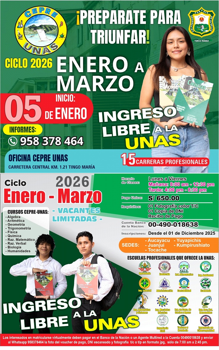 PARA PODER INSCRIBIRSE ACERCARSE A LA OFICINA DEL CENTRO PREUNIVERSITARIO DE LA UNIVERSIDAD NACIONAL AGRARIA DE LA SELVA Y TRAER SUS REQUISITOS MENCIONADOS.
