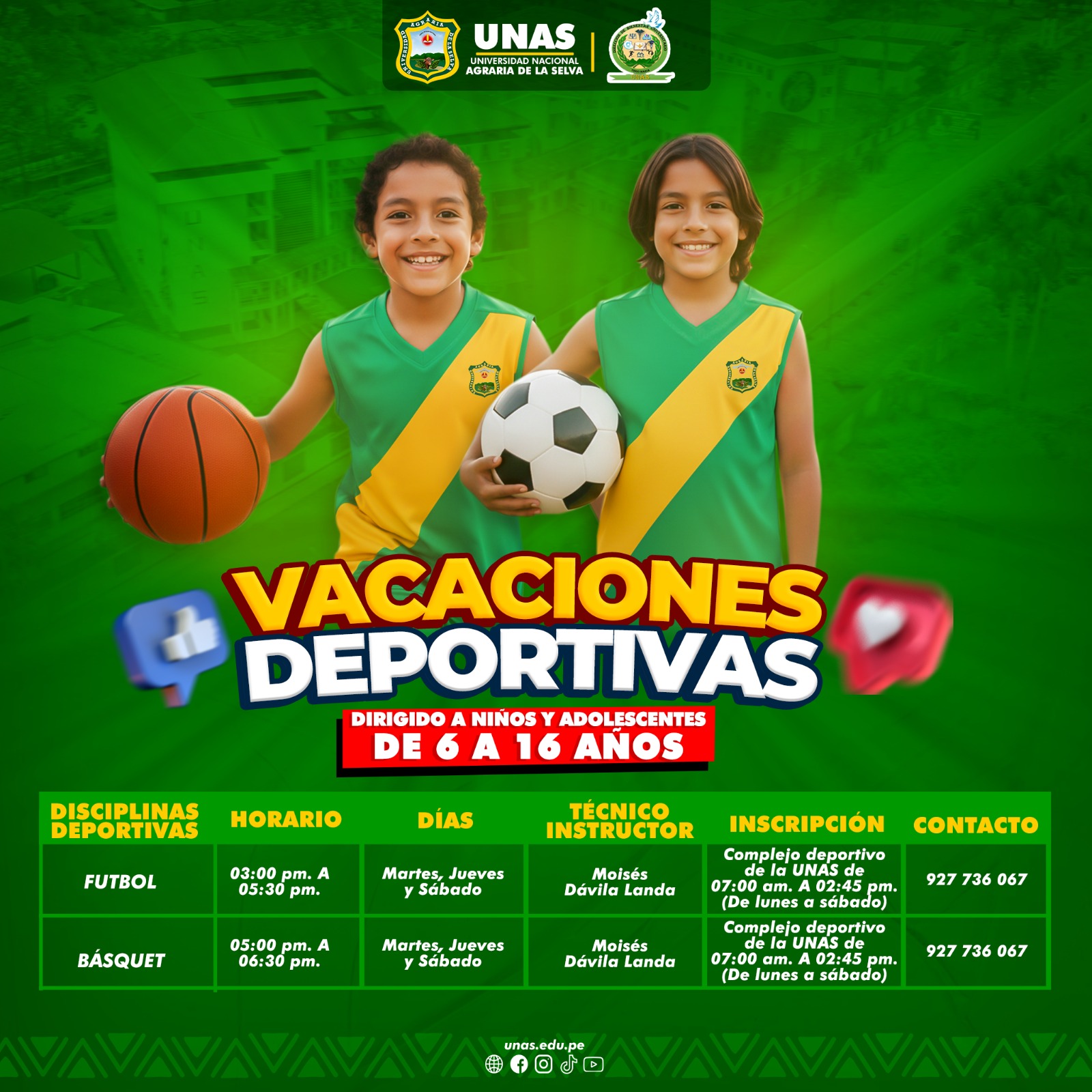 Las actividades deportivas se desarrollarán en las disciplinas de fútbol y básquet, y se llevarán a cabo del 19 de enero al 21 de febrero de 2026, en las instalaciones del Complejo Deportivo de la UNAS, bajo la conducción del instructor Moisés Dávila Landa.